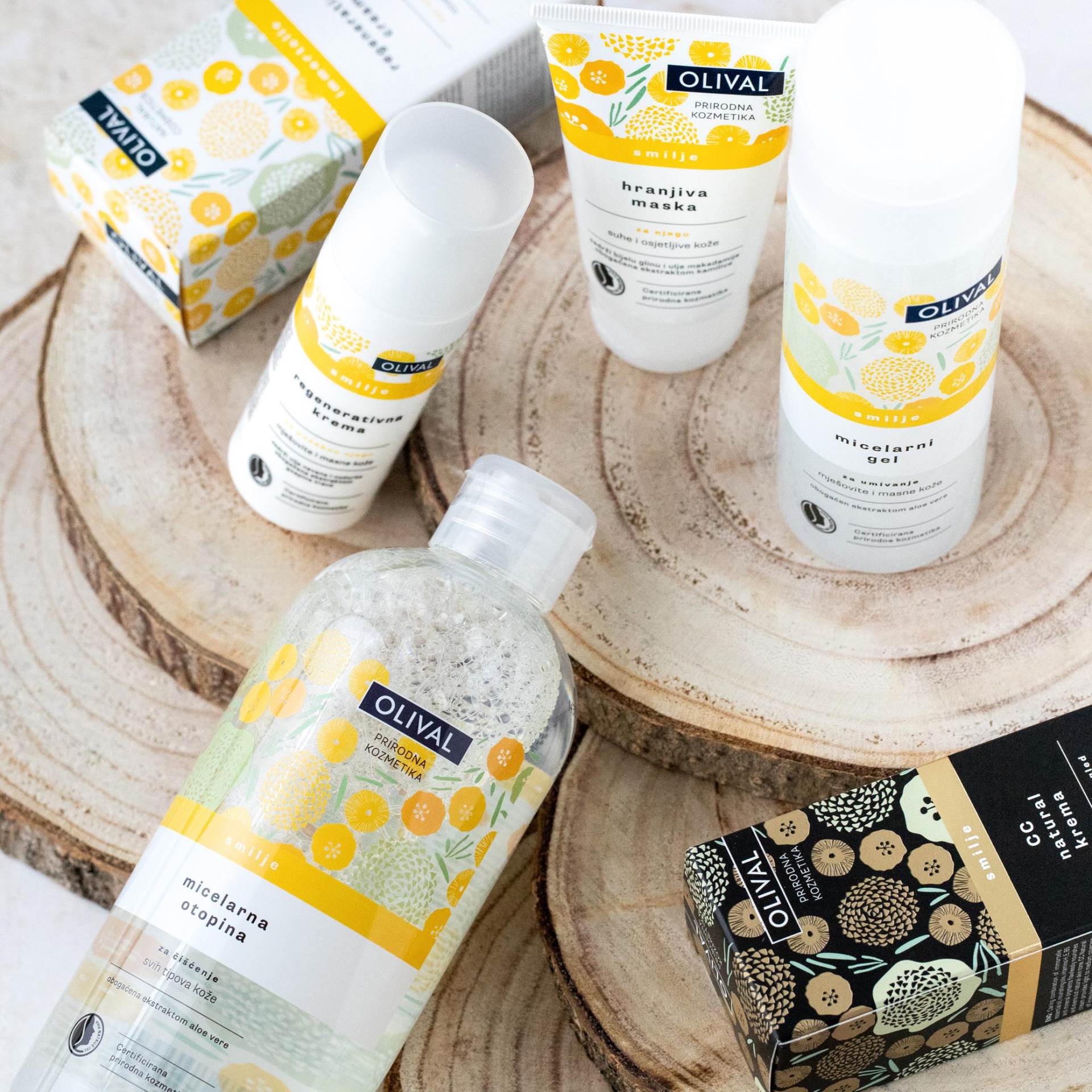 Olival Micelarna otopina Smilje ili Micelarna otopina 2 u 1 Smilje bogate su eteričnim uljem smilja i ekstraktom aloe vere. Micelarna otopina Smilje je pogodna za blažu šminku i nečistoće, dok je Micelarna otopina 2u1 Smilje, zbog svoje dvofazne formulacije, izvrsna opcija kod jače šminke. Preporučuje se koristiti ih kao prvi korak u čišćenju kože lica. Za sve one koji preferiraju mlijeka za čišćenje oduševit će maziva i nježna tekstura Njegujućeg mlijeka Smilje. Bazirano na eteričnom ulju smilja i uljima sezama i noćurka, učinkovito uklanja šminku i čisti nečistoće. Za drugi korak, a ovisno o tipu kože lica, Olivalovi stručnjaci preporučuju umivanje Micelarnim gelom ili pjenom Smilje. Oba ova proizvoda kožu lica učinkovito čiste bez isušivanja i osjećaja zatezanja. Aloa vera umiruje i hidratizira, a ulje smilja regenerira ostavljajući na koži ugodan osjećaj mekoće i nježnosti.
