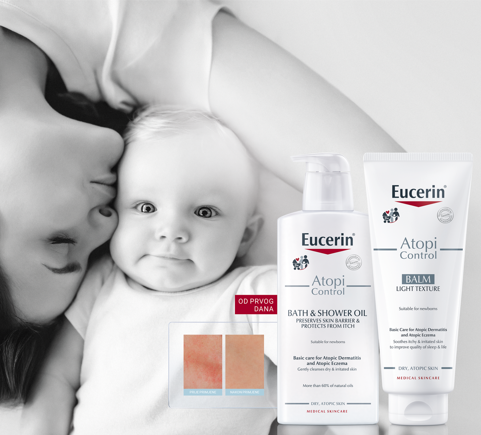 Kad koža djeteta pokazuje simptome iritiranosti ili suhoće, roditelji se mogu osloniti na AtopiControl balzam za smirivanje i njegu. A kad je vrijeme kupanja, AtopiControl ulje za pranje bez sapuna nježno čisti dok istovremeno podržava prirodnu zaštitnu funkciju kože. Za akutnu fazu atopijskog dermatitisa, kad je koža upaljena, tu je i Eucerin AtopiControl Akut krema za njegu kože sklone crvenilu, pogodna za bebe od četiri tjedna, kao i Eucerin AtopiControl sprej za nadraženu kožu, pogodan za djecu u od treće godine.