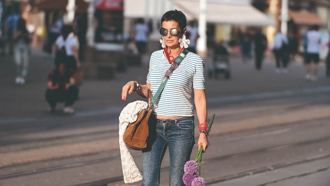 U trapericama, pamučnoj majici i s cvijetom u ruci svestrana dizajnerica Leonarda Lončar nije mogla proći nezamijećeno našem fotografu. Pogotovo zbog nove, kratke frizure koja joj sjajno pristaje.