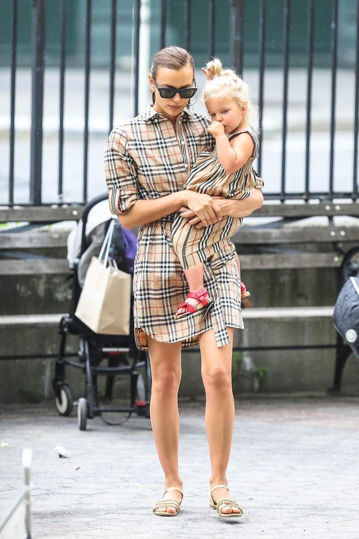 Za igru u pješćanom dječjem parku, ruska je manekenka odabrala Burberry haljinu, koja je trenutno dostupna za kupnju i koja košta 690 dolara. Svoju je haljinu odlučila uskladiti s haljinicom svoje kćerkice, koja košta 220 dolara i koja joj odlično pristaje uz plavu kosu i crvene sandale. Irina je odabrala haljinu na kopčanje, koja joj vezanjem u struku ističe vitku liniju. Manekenka je svoju odjevnu kombinaciju upotpunila ravnim sandalama, crnim sunčanim naočalama i zlatnim hoop naušnicama.