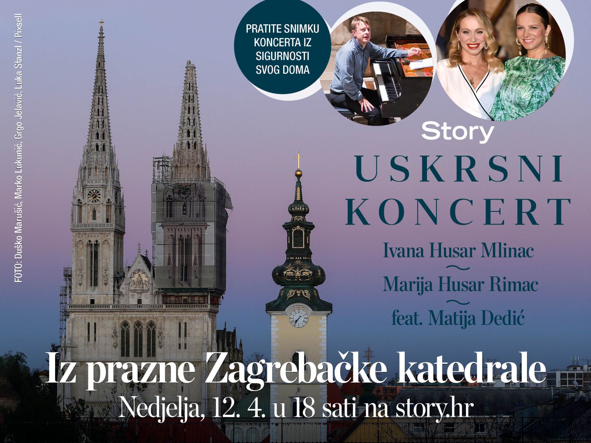 U nedjelju 12. travnja od 18.00 sati, na najsvetiji blagdan katoličke Crkve, na sam Uskrs, Story vam donosi snimku jedinstvenog koncerta vrhunskih vokala sestara Husar, Ivane Husar Mlinac i Marije Husar Rimac, uz pratnju prestižnog pijanista i skladatelja Matije Dedića. Koncert ćete ekskluzivno moći pratiti putem portala Story.hr, iz sigurnosti svoga doma. Ovim prigodnim koncertom želimo Storyjevoj publici i svekolikoj javnosti pružiti dodatnu nadu i osnažiti im duh, pružiti sadržaj koji će im pomoći da ovaj Uskrs obilježe što dostojanstvenije, svečanije i uz omiljene izvođače.