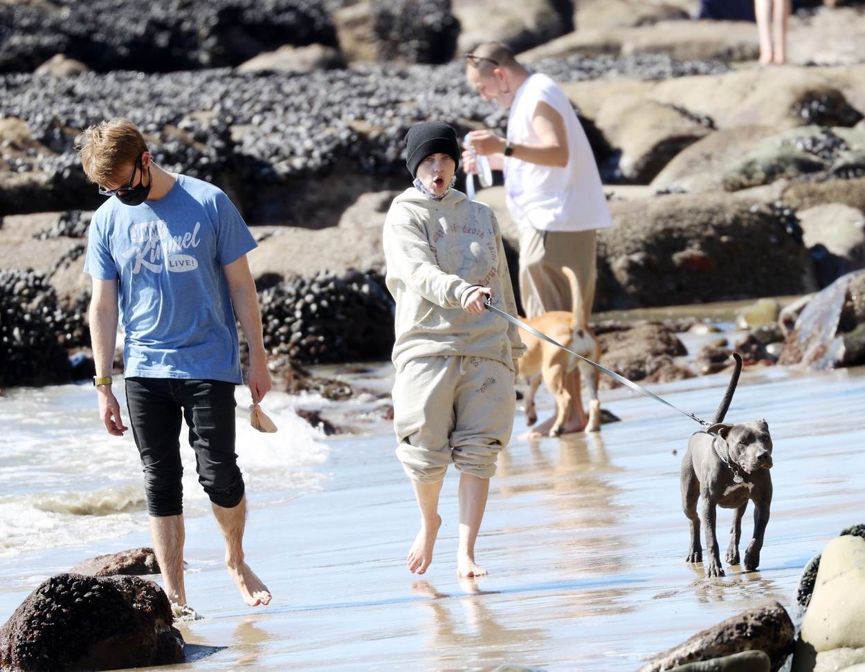 Devetnaestogodišnja američka glazbena superzvijezda Billie Eilish provela je opušteni dan na plaži u Malibuu sa svojim bratom i producentom Finneasom O’Connellom te njegovom djevojkom Claudijom Sulewski. S njima su bili i njezini razigrani psi Shark i Peaches, za kojima je trčala i uživala u igri na pijesku, odjevena u udobnu sivu trenirku.