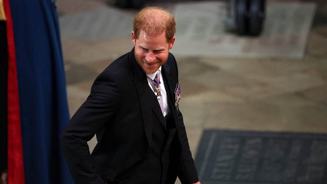Odbjegli Charlesov sin na krunidbu je stigao među zadnjima, očekivano bez supruge Meghan. Dok su ga svi gledali, u opatiju je ušetao nasmiješen.