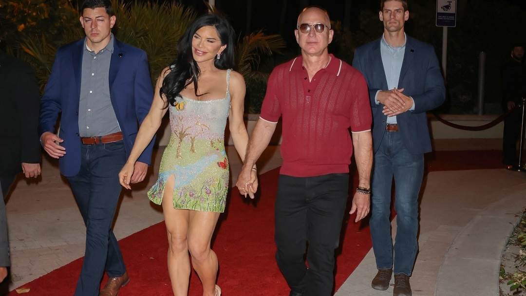 Fotografije prikazuju kako je Bezos izabrao ležernu kombinaciju crvene (pomalo prozirne) majice i crnih hlača, dok je Lauren izabrala vrtoglavo visoke štikle i usku mini haljinu.