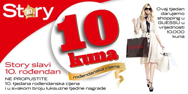 Povodom svog desetog rođendana Story vas ponovno daruje! Do 11. lipnja pošaljite SMS na broj 60010 (2,40 kn/sms) sa sadržajem: Story+razlog zašto baš vi želite taj shopping+vaše ime, prezime, adresu, i osvojite 5 X 2000 kuna za fanatastičan shopping u Guessu. Imena sretnih dobitnika objavit ćemo 13. lipnja u tiskanom izdanju Storyja. I tu priča ne prestaje!