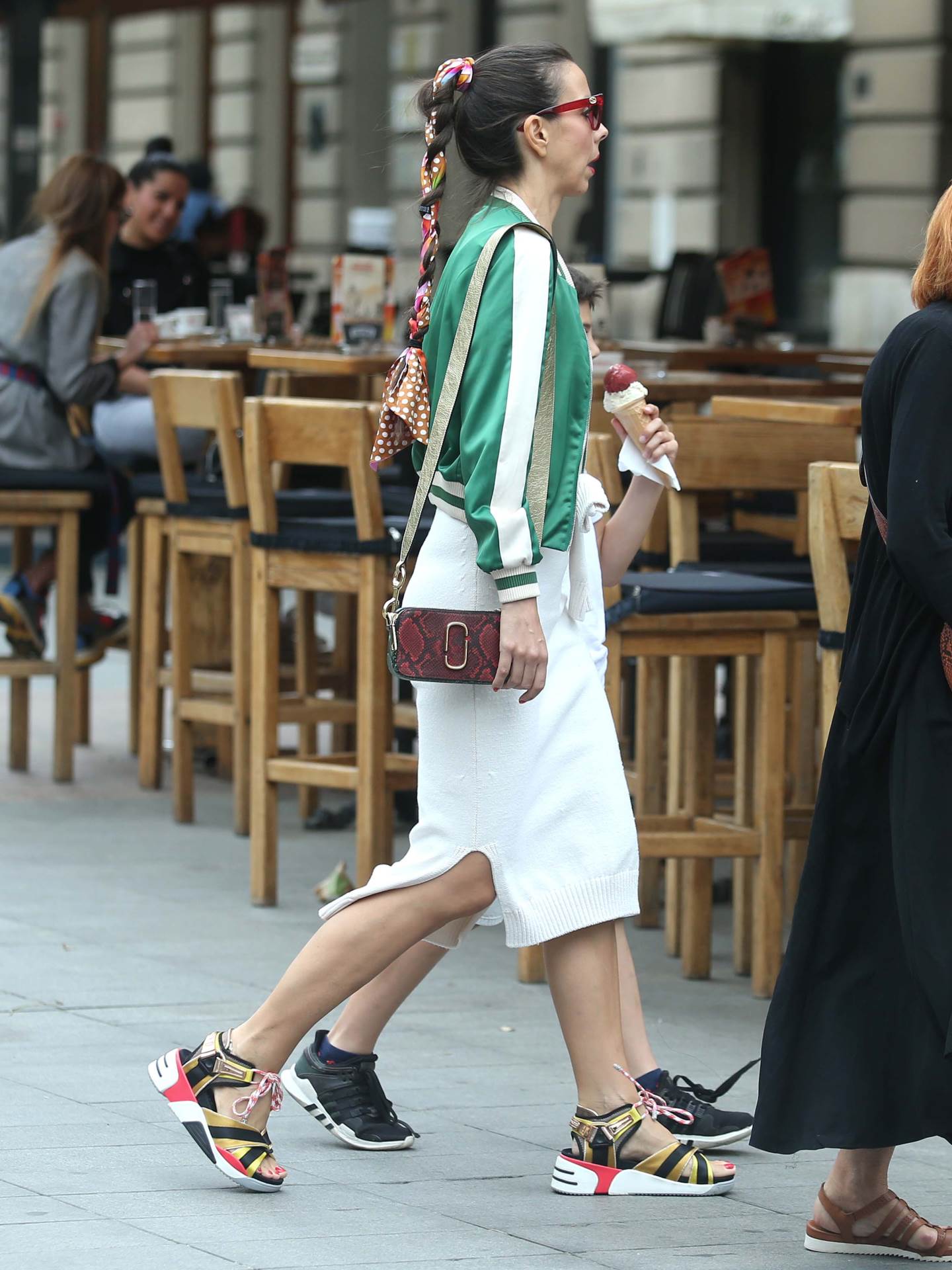 Potpuno bijeli styling razbila je s detaljima u obliku crno zlatnih trendi predimenzionalnih sandala, svilenkaste bomber zelene jakne koja se savršeno uklopila uz bijelu haljinu midi dužine i malu clutch torbicu zmijskog uzorka u crvenoj boji. Kako ne bi završila samo na tome, Olja je uokvirila cijeli outfit napravivši visoki rep oko kojeg je omotala maramu i crvenim sunčanim naočalama koje savršeno pristaju uz mini torbicu.