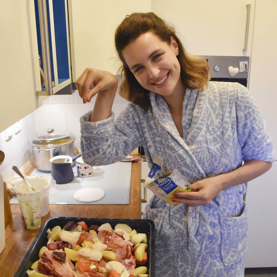 'A kako drugo nedjeljom, nego bez šminke, u kučnom ogrtaču cijeli dan i uz obavezni kolač nakon (pre)obilnog ručka?' napisala je Doris u opisu fotografije na kojoj sjedi za stolom, dok joj u krilu društvo pravi sin Donat pred kojim na stolu izviruje čokoladna torta. Pored njih stoji još jedna članica obitelji koja u naručju nosi malenu Gitu, voditeljičinu petomjesečnu kći.