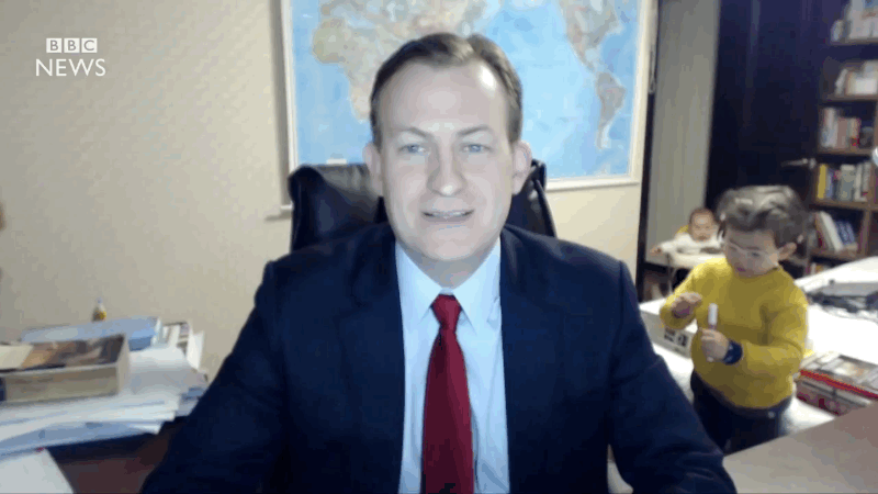 Kada je počeo intervju njegova obitelj u drugoj je sobi na televizoru gledala oca, a kada ga je četverogodišnja kći Marion ugledala na malom ekranu odlučila ga je i potražiti u drugoj sobi jer je prepoznala otkud se njezin tata javlja.