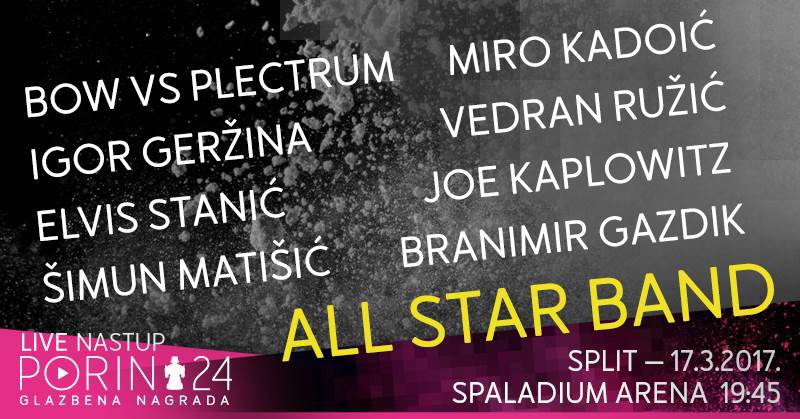 Na Porinu će izvesti skladbe svih nominiranih jazz izvođača. - Za ovu prigodu složio sam medley od skladbi svih nominiranih jazz izvođača, pa će se u četiri i pol minute odsvirati moj "Ivan Klakar", "Funky" Igora Geržine, "Tanac z triljun" Vedrana Ružića, "Blues za sutra" Joa Kaplowitza, gdje će svirati i Šimun Matešić, "Mista Dance" od Bow Vs Spectrumb i "Hugo" Mire Kadoića - rekao je Elvis Stanić. Nastup uživo All Star Banda možete pogledati 17, ožujka u izravnom prijenosu na Prvom programu Hrvatske televizije te u programu Hrvatskog radija s početkom u 20 sati. Bow vs Plectrum (gudalo protiv trzalice) duo je Filipa Novosela (tambura) i Tihomira Hojsaka (kontrabas), nastao s idejom o spajanju dva žičana instrumenta različite tradicije sviranja. Glazba koju ovaj duo izvodi kombinira mnoge glazbene stilove, ali je ipak svoje temelje našla u etno glazbi šire balkanske i panonske regije te suvremenog jazza. Njihov album "Bow VS Plectrum" ove je godine dobio tri nominacije i to za Najbolji instrumentalni album, Najbolju instrumentalnu izvedbu dok s Matijom Dedićem imaju nominaciju i za Najbolju izvedbu jazz glazbe. Igor Geržina višestruki je dobitnik Porina i jedan od naših najpoznatijih instrumentalista. Diplomirao je saksofon na Muzičkoj akademiji u Zagrebu te studirao na Berklee College Of Music u Bostonu. Surađivao je s gotovo svim najvećim imenima hrvatske glazbene scene, a glazba s njegovih autorskih albuma emitira se na radio postajama u 15 zemalja na čak četiri kontinenta. Posljednji singl snimljen u suradnji s češkom saksofonisticom Magdalenom Chovancovom emitira se na američkim Billboard radio postajama. Njegov prošli album osvojio je 2 Porina, a novi album “Bucket List” ima dvije nominacije i to u kategorijama Najbolji instrumentalni album i Najbolja instrumentalna izvedba. Elvis Stanić jedan je od najboljih hrvatskih suvremenih gitarista i harmonikaša. Vođa je sastava Elvis Stanić Group, jazz fusion skupine koja spaja mediteransku melodioznost tradicionalne hrvatske glazbe s ritmovima latino izričaja i suvremenim jazz tendencijama. Kao skladatelj, posebno je posvećen proučavanju kako hrvatske tako i svjetske tradicionalne glazbe, te je i na području tzv. World glazbe jedan od vodećih glazbenika u Hrvatskoj. Stanić na ovogodišnjem Porinu nominacije ima za album “Familija” Olivera i Gibonnija, koji je producirao s Nikšom Bratošom, a također je nominaciju dobio i za svoj album “Criss-Cross” i to za Najbolji album jazz glazbe. Šimun Matišić istaknuti je hrvatski vibrafonist, najmlađi među ovogodišnjim nominiranim instrumentalistima, koji je lani s Matijom Dedićem snimio hvaljeni album "Fortune Smiles". Riječ je o snimci uživo koji se održao 2014. godine u zagrebačkom muzeju Mimara. Na album su uvrštene izvedbe 10 skladbi triju velikana jazza: Keitha Jarretta, Pata Methenyja i Chicka Coreaea. Taj album prepoznala je i struka pa je za nagradu Porin nominiran u kategoriji za Najbolji album jazz glazbe, a istoimena skladba za Najbolju izvedbu jazz glazbe. Multiinstrumentalist Miro Kadoić diplomirao je na Muzičkoj akademiji u Zagrebu stekavši zvanje akademskog glazbenika - klarinetista. U New Yorku se usavršavao na Manhattan School of Music, bio je član Plesnog orkestra Radija Zagreb i Big Banda RTV Slovenija, a trenutačno je član Jazz orkestra HRT-a. Njegov posljednji album “Endless Summer" osvojio je i nominacije na 24. izdanju Porina, a dobio ih je u kategoriji Najbolji album jazz glazbe, dok istoimena pjesma ima nominaciju za Najbolju skladbu jazz glazbe, a skladba ‘Hypnosia’ ima nominaciju u kategoriji Najbolja izvedba jazz glazbe. Vedran Ružić mladi je umjetnik iz Matulja, koji je završio Fakultet za hotelski i turistički menadžment, pohađao je jazz konzervatorij u Klagenfurtu, a trenutačno je student Akademije za primijenjenu umjetnost u Rijeci. Za sebe kaže da je renesansni čovjek koji se bavi glazbom i slikanjem. On je također jedan od nominiranih za nagradu Porin. Njegov album “Spiritual Market” nominiran je za Najbolji album jazz glazbe, a skladba ‘Navigare’ u kategoriji Najbolja skladba jazz glazbe. Pijanist, orguljaš, skladatelj i aranžer Joe Kaplowitz glazbom se profesionalno počeo baviti s 15 godina u Washingtonu. Surađivao je s poznatim američkim blues i jazz glazbenicima, vodio je sastave koji su nastupali u Bijeloj kući te klubovima Blues Alley, The Knitting Factory i The House of Blues. Godine 2006. doselio se u Hrvatsku gdje nastupa s poznatim hrvatskim glazbenicima te je aktivni studijski glazbenik. Stalni je član Davor Križić Experimenta i trija gitarista Brune Mičetića te kvinteta klasične glazbe Simply Brass u kojem svira tubu. Njegova skladba "Donna Lee Is Pissed Off" dobila je nominaciju i na Porinu u kategoriji Najbolja skladba jazz glazbe.
