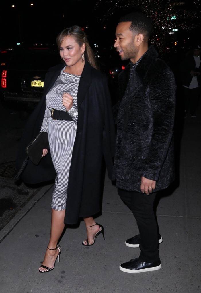 A trudnoća ju nimalo ne sputava da uživa u svojim omiljenim komadima, kao što su uske hlače ili pak dugačke haljine koje voli zategnuti u struku. Jednu takvu, samo kraću nosila je za večeru s Johnom u New Yorku. Chrissy je izgledala senzacionalno u srebrno sivoj haljini s remenom u struku i sandalama s vrtoglavo visokim potpeticama koje obožava nositi. Preko je prebacila crni kaput, a u ruci nosila crnu torbicu.