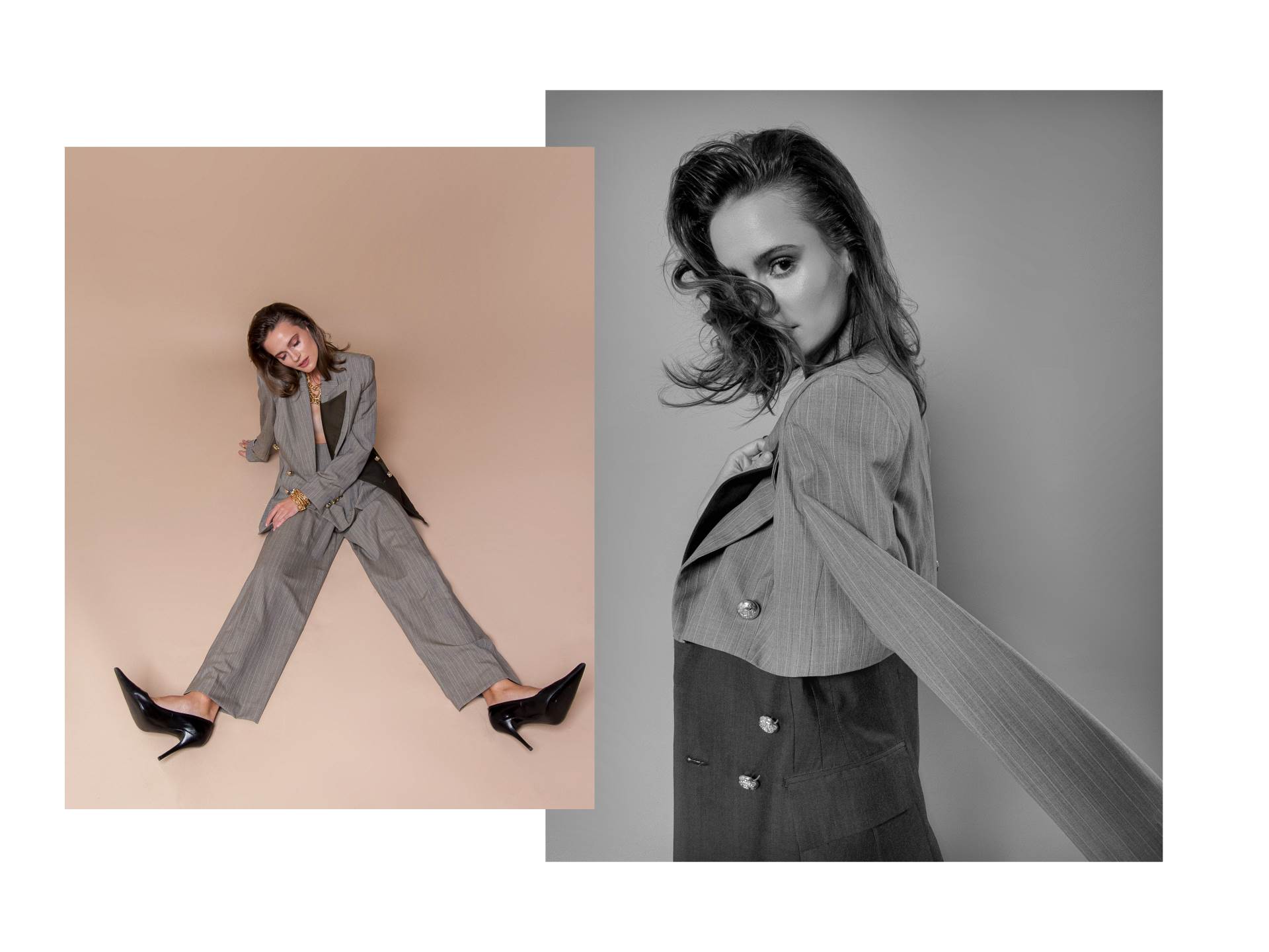 Statement komad kolekcije svakako su blejzeri, smjelo skrojeni da naglašavaju ramena, sužavaju struk i ostavljaju dojam mitske skulpture. Patchwork elementi blejzera s duplim fazonama kreiraju komad koji postaje neizostavan element ženske garderobe. Neutralne jesenje boje poput smeđe i bež izmjenjuju se s kariranim uzorkom, dok im se kao suprotnost javljaju pozlaćeni detalji kroz gumbe i sjajno remenje u stilu 80-ih. Kroz draping, manipulaciju nabora košulja i haljina postiže se voluminoznost i transformacija materijala u trodimenzionalnu formu.