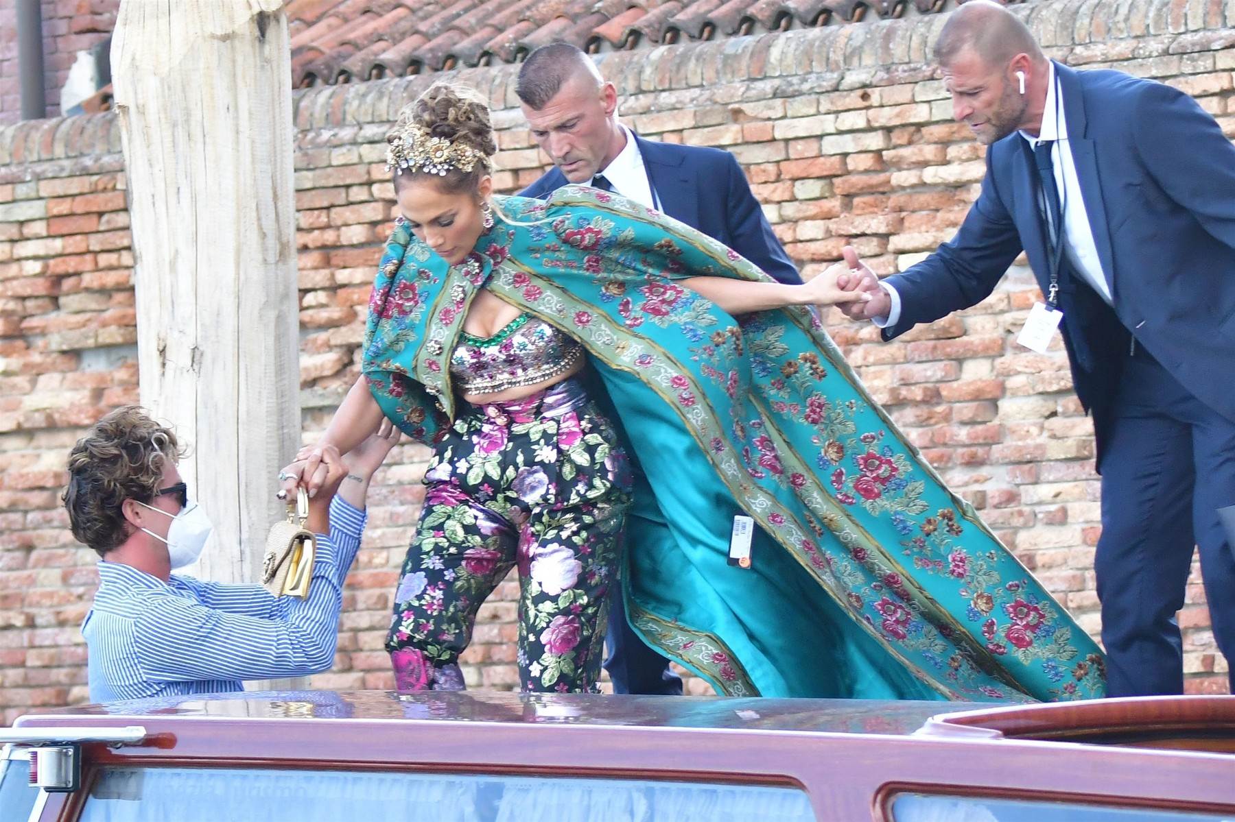 J.Lo je, naime, za tu prigodu odjenula glamuroznu D&G kombinaciju sastavljenu od topa i hlača cvjetnog uzorka, zlatnih cipela i torbice te kaputa koji je izazvao lavinu reakcija na društvenim mrežama.