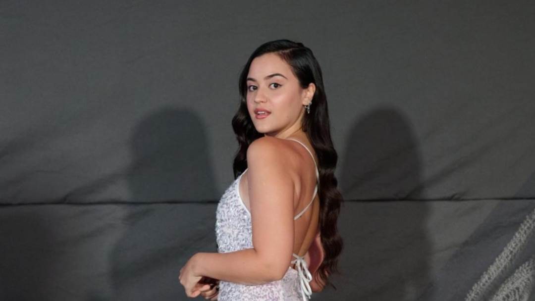 Pozirala je u dugačkoj.bijeloj haljini sirena kroja sa srebrnim šljokicama i otvorenim leđima kojom je istaknula svoju vitku figuru.