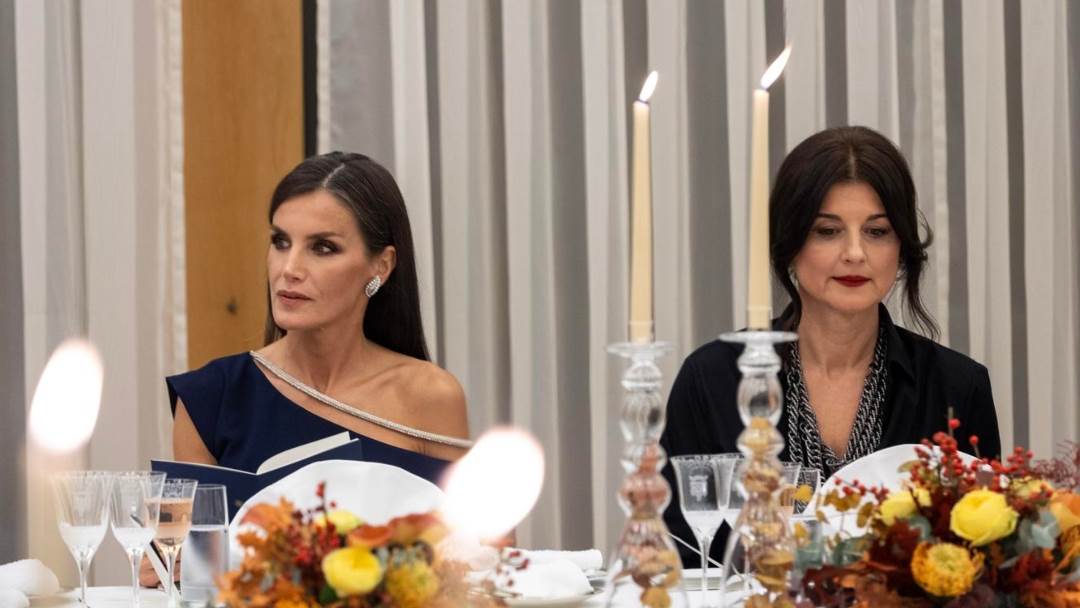 Kraljica Letizia, često nazivana ikonom stila, odlučila se za tamnoplavu midi kreaciju s golim ramenom i srebrnim detaljem te salonkama u istoj nijansi.