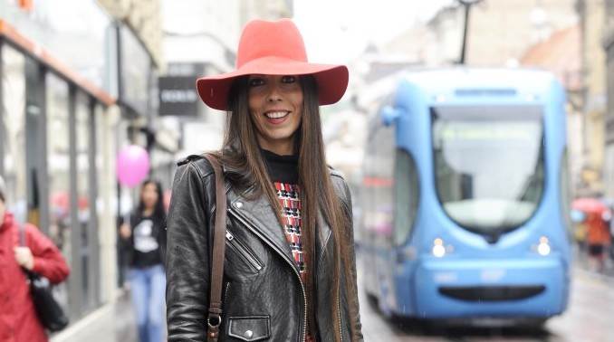 Tmuran je dan odlučila razveseliti haljinom A-kroja na crvene i crne prugice, kožnatom jaknom, Susanna gležnjačama s potpisom modne kuće Chloe, velikom torbom s dugim crvenim resama te velikim šeširom mekog oboda, također u crvenoj boji kojim se zaštitila od kapi kiše.