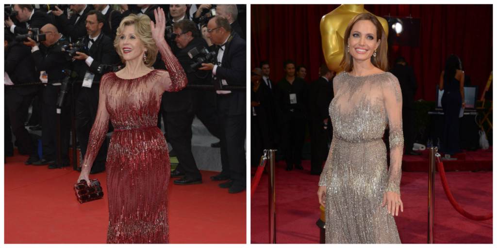 Nakon što je na ovogodišnjoj dodjeli nagrade Oscar, Angelina Jolie oduševila izborom haljine Elie Saaba, za istog se dizajnera, točnije za istu haljinu no u drugoj boji odlučila legendarna Jane Fonda. Angelina je tako na crvenom tepihu dodjele zlatnih kipića osvojila modne kritičare kad se pojavila u dijelom prozirnoj, te svjetlucavoj haljini Elie Saab Couture u bji pijeska, koja se savršena slijevala uz njezinu figuru.