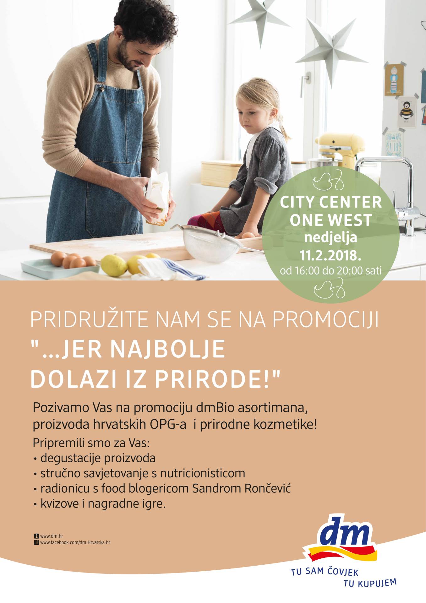 Već dulje vrijeme smišljate kako razviti životne navike u skladu s prirodom? Ne znate točno odakle krenuti i koliko sve to košta? Imate sreće jer veljača je mjesec u kojem sve najbolje dolazi iz prirode i to izravno u dm! Stoga vas pozivamo na promociju proizvoda osviještene prehrane i prirodne kozmetike koja će se održati ispred prodavaonice dm-a u shopping centru City Center one West u nedjelju 11. veljače 2018. od 16 do 20 sati.