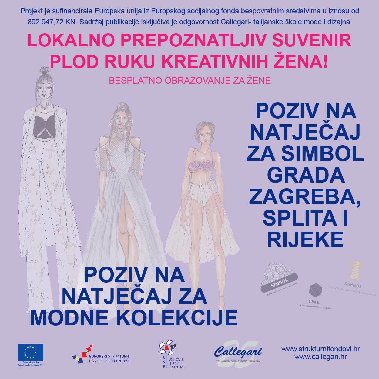 Kako bi osigurala kvalitetu, originalnost i turističku atraktivnost suvenira - ženskih odjevnih predmeta i modnih dodataka koje će osmisliti i izraditi kroz svoj najnoviji EU projekt, Callegari – talijanska škola mode i dizajna raspisala je Natječaj za originalni dizajn lokalno prepoznatljivog simbola grada Zagreba, grada Splita i grada Rijeke. Ovim natječajem Callegari poziva sve zainteresirane dizajnere i umjetnike da osmisle inovativan, destinacijski prepoznatljiv, kulturno – povijesno i estetski vrijedan te ujedno suvremen dizajn simbola grada Zagreba, Splita i Rijeke koje će aplicirati na dizajnerske modne kolekcije.