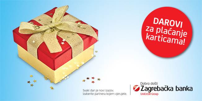 A onda dolazi ugodno iznenađenje – prvi dar koji za Vas stiže i prije nego što zazvone zvončići! Za svaku kupnju iznad 100 kn MasterCard (Standardna, Zlatna, go!card, Platinum, Student) i Maestro karticama Zagrebačke banke, jednokratno ili na rate bez kamata, u razdoblju od 9. do 23. prosinca darujemo vas prigodnim darom.