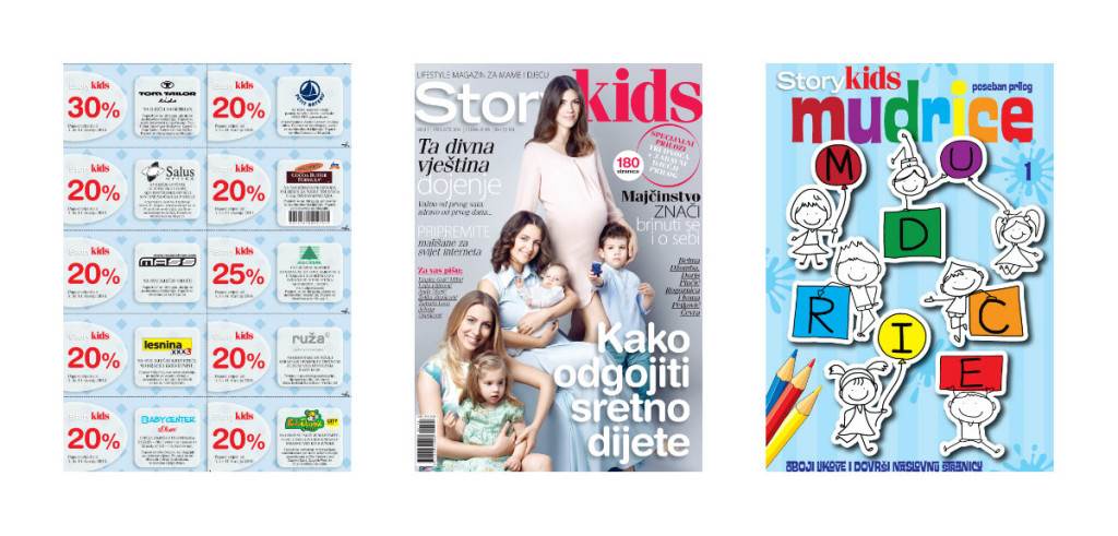 Za naslovnicu prvog Storykidsa sa svojim su mališanima pozirale glumica Doris Pinčić Rogoznica sa sinčićem Donatom, Belma Džomba s kćerkicom Unom, te trudna bivša Miss Hrvatske, Ivana Petković Čevra sa svojim mezimcem Markom.