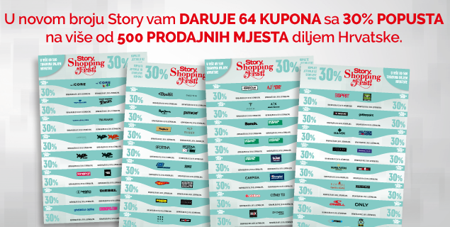 Kako ne biste u zadnji tren bezuspješno hodali po dućanima u kojima su modni noviteti već rasprodani, najbolje je da shopping obavite već sada. Story samo za vas spušta cijene u velikom jesenskom Story shopping festu. Užitak Story shoppinga garantiraju 64 vrhunska branda u više od 500 trgovina diljem Hrvatske. Tjednik Story Vas poziva da u razdoblju od 12. do 19. listopada 2016. uživate u kupnji sa 30% popusta uz čak 64 kupona iz Storyja! Za ostvarivanje popusta potreban je kupon iz tjednika Story, koji izlazi u srijedu 12. listopada 2016. Uživajte u slatkim ženskim radostima uz vaš Story!