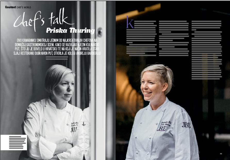 Kada je prije nekoliko godina Priska Thuring preuzela vodstvo kuhinje Dubravkina puta, rijetki su vjerovali da će se pomalo ocvali zagrebački restoran bitno promijeniti. Dolazeći iz velikog hotelskog sustava, uvijek pomalo u sjeni bivšeg životnog partnera i kolege, nije se činila kao najbolji izbor za poznatu zagrebačku gastronomsku adresu. No Priska je to demantirala. Čvrsta u vodstvu kuhinje, stroga u kombiniranju okusa i namirnica u tanjuru, vratila je restoran koji vodi na vrh gastronomske karte Hrvatske. Tehnički napredna, okusima istančana, s notom ženske rafiniranosti, njezina jela lako se mogu kopirati, a to je cilj kojem bi trebao težiti svaki bolji kuhar. Njezini rezultati pobijaju sintagmu da hrvatska publika zaobilazi autorsku kuhinju. O putu koji ju je doveo u Zagreb, o težnjama i planovima razgovarali smo jednog jesenskog dana na terasi Dubravkina puta. Andrej: Možeš li nam objasniti kako je jedna Švicarka, odnosno Kanađanka završila u Zagrebu? Priska: Imala sam dva smjera kojima sam željela da ide moja karijera - jedan je bio uređenje interijera, iako ne znam matematiku i ne znam crtati, a i škola u Kanadi bila je prilično skupa, a drugi smjer bio je kuhanje. Onda mi je mama rekla da moram otići iz Kanade u Švicarsku izaberem li kuhanje kao poziv. Andrej: Znači, od malih je nogu postojala ta želja da postaneš kuharica?Priska: Uvijek sam bila s mamom u kuhinji, iako tada nisam znala da ću se time baviti kad odrastem. Više sam se vidjela kao dizajnerica interijera, ali kad mi je tata rekao da ne znam matematiku, geometriju još manje, a crtanje da i ne spominjemo, počela sam razmišljati o kuhanju kao pozivu. Ionako sam stalno bila u kuhinji, kad god je bio neki rođendan, neka proslava, obljetnica, ja bih kuhala za mamu i tatu. Još u Kanadi počela sam raditi u nekoliko restorana, vikendom ili nakon škole ili tijekom praznika. Htjela sam zapravo raditi kao konobarica, da bih zaradila džeparac, ali ispalo je da bi im uvijek trebao prije netko u kuhinji pa sam tako počela. Prvo iskustvo bilo je, naravno, pranje suđa. Kad bih s time završila, samoinicijativno bih otišla pomoći u kuhanju i tako sam zapravo stjecala iskustvo. Sve je to nekako ispalo slučajno, ja sam samo htjela zaraditi za gorivo za svoj auto. Ipak, bilo mi je fora kuhati, osjetiti taj adrenalin, bez obzira na to što su to bili mali obiteljski restorani s klasičnim menijem. Tad mi je palo na pamet da ako se odlučim baviti kuhanjem u životu, mogu proputovati i svijet. Moja prva ideja bila je da radim po kruzerima. Mama mi je rekla da najprije moram završiti školu, neka odem u Švicarsku gdje su dobre kulinarske škole koje su mi, s obzirom na to da imam i švicarsko državljanstvo, besplatne, odnosno dio plaća restoran u kojem odrađuješ praksu, a ostatak država. Mi zaista nismo imali novca, tek poslije sam shvatila da su me gurali u Švicarsku na školovanje jer mi zapravo nisu mogli priuštiti nešto drugo.