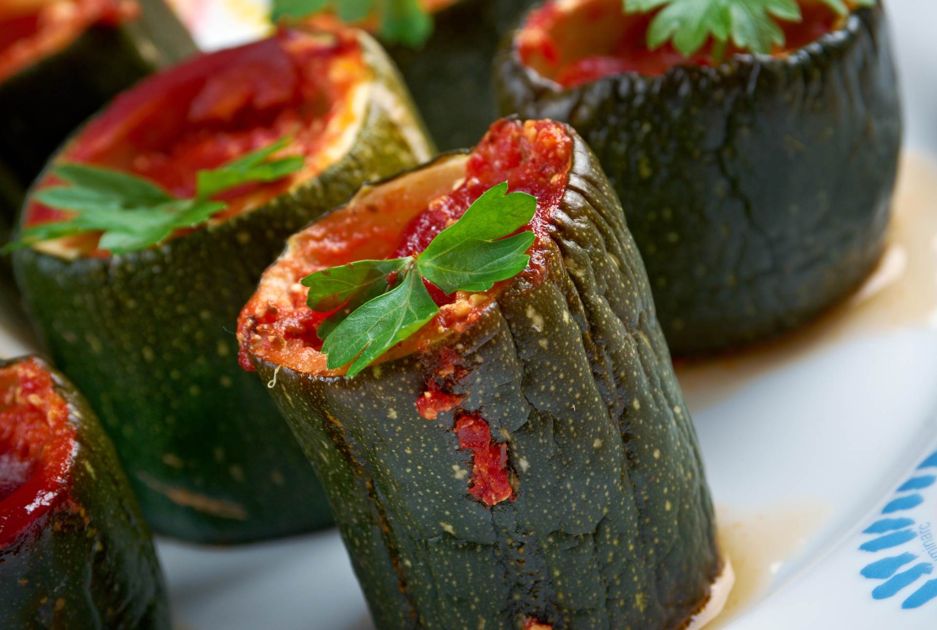 Smjesa: U tavi, na 2 žlice ulja, zapržiti jedan srednje veliki, narezani luk, dodati meso, malo ga popržiti pa ohladiti. U meso potom dodati narezana 2 češnja češnjaka, peršin i 1 tučeno jaje, te sve dobro izmiješati. S tim nadjenuti tikvice, staviti ih u lonac, pirjati sa svih strana. Zatim doliti temeljac s malo soka od rajčice te sve pirjati na laganoj vatri sat vremena. Po potrebi uliti još vode ili temeljca a ako želite gušći umak, možete pred kraj dodati malo brašna. Poslužiti uz kuhani krumpir, po želji.