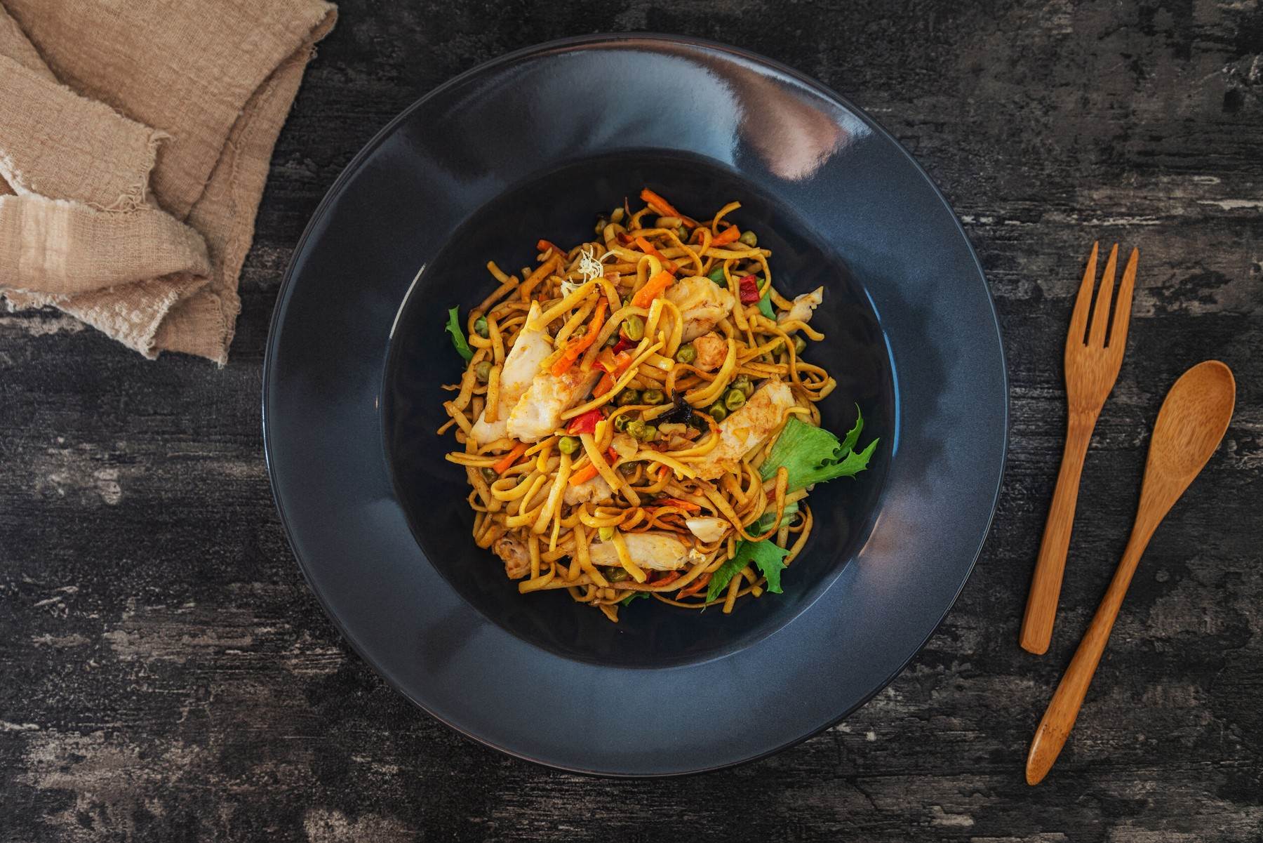Priprema: piletinu operite i narežite na komadiće. Pomiješajte škrobno brašno i sojin umak te prelijte po mesu. Papriku narežite na trakice, a mladi luk i čili papričicu na komadiće. U tavi zagrijte ulje pa popržite gljive. Izvadite ih i posolite. U tavu stavite pripremljeno povrće, dodajte temeljac, zakuhajte, dodajte meso s marinadom, octom, šećerom i gljivama. Zavrijte i poklopljeno kuhajte oko 7 minuta. Poslužite uz kuhanu ružu ili kineske rezance.
