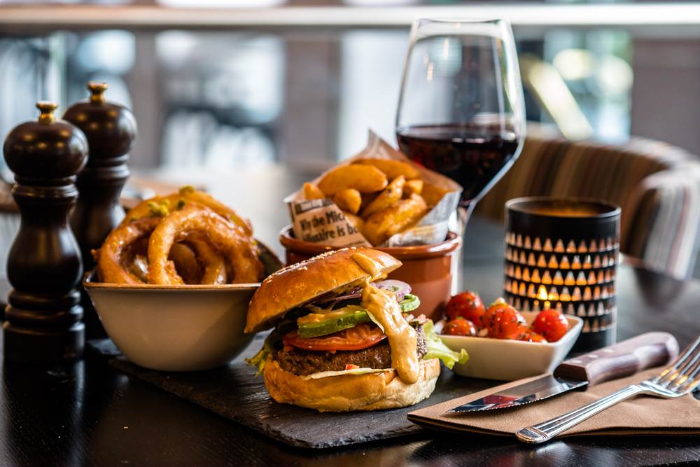 Originalni hamburgeri su od mljevenog junećeg mesa koje traži crveno vino. Kod nas znaju umiješati svinjetinu kako bi dobili sočnost. Sira može biti, tad je riječ o cheeseburgeru, a i ne mora. Sastojci su i list salate, preprženi luk, ploška rajčice, te umaci od rajčice i/ili onaj na bazi majoneze, a cjelokupnoj kombinaciji pristaje laganije i svježe crveno vino. Takvo je Kapistran crni, kvalitetno vino Iločkih podruma od frankovke i cabernet sauvignona. Lijepo miriše po crnom bobičastom voću poput kupine, vitkog je tijela, a buteljka je u internetskoj prodavaonici vinarije 34,99 kuna.