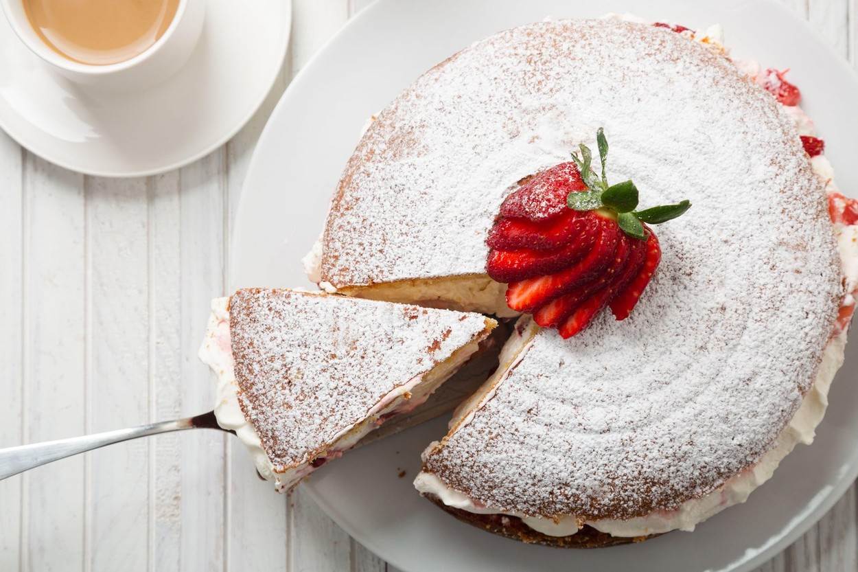Biskvite prerežite u dva sloja. Premažite s marmeladom, dodajte bogati sloj kreme te nadjenite komadićima jagoda. Poklopite drugom polovicom. Po želji premažite tortu kremom izvana ili samo ukrasite s kremom i jagodama.