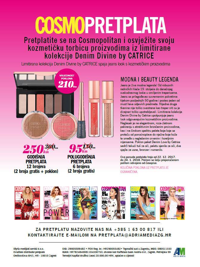 Jeans je živa modna legenda! Od robusnih radničkih hlača 19. stoljeća do današnjeg svakodnevnog looka u omiljenim trapericama. Jeans se prilagođavao suvremenim pokretima tijekom posljednjih 50 godina i postao jedan od must have odjevnih predmeta. Nijedna druga tkanina nije toliko svestrana kao traper niti su je dizajneri toliko upotrebljavali. Limitirana kolekcija Denim Divine by CATRICE upotpunjuje jeans look odgovarajućim kozmetičkim proizvodima. Naglasak je na elegantnom, rozo-zlatnom pakiranju s atraktivnim brončanim proizvodima kao i na širokom spektru paleta boja koje se protežu od ponoćno plave do nježne boje kože te smeđe s naglašenim crvenim i koraljnim nijansama. Poklon-paket Denim Love by Catrice sadrži tekući tuš za oči, paletu sjenila za oči, dva sjajila za usne, bronzer i rumenilo. Pretplatite se na Cosmopolitan i poklanjamo vam paket proizvoda iz kolekcije Denim Love by Catrice. Godišnja pretplata iznosi 250,00 kuna, a uključuje 12 brojeva i poklon. Vrijednost poklona je 210,00 kuna, a ponuda pretplate vrijedi do 24. siječnja 2018. godine.
