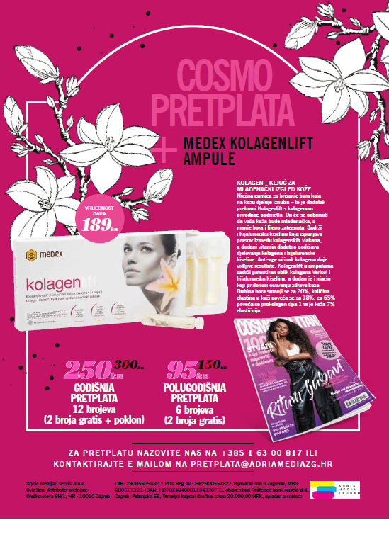 Ne propustite aktualnu ponudu godišnje pretplate na magazin Cosmopolitan! Pretplatite se i poklonit ćemo vam Medex Kolagenlift ampule. Požurite jer ponuda vrijedi do kraja ožujka!