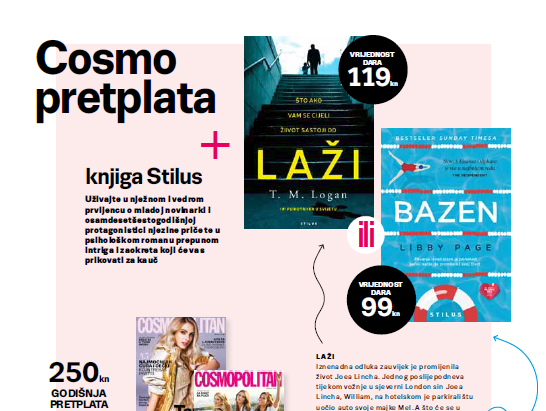 Uz kupnju godišnje pretplate na Cosmopolitan poklanjamo vam knjigu izdavačke kuće Stilus. Ponuda vrijedi do 30. rujna 2019. godine. Godišnja pretplata uključuje 12 brojeva časopisa Cosmopolitan (pri čemu su dva broja gratis) i dar – knjigu Laži (vrijednost dara 119 kn) ili knjigu Bazen (vrijednost dara 99 kn). Odaberite svoj naslov i požurite jer količine darova su ograničene.