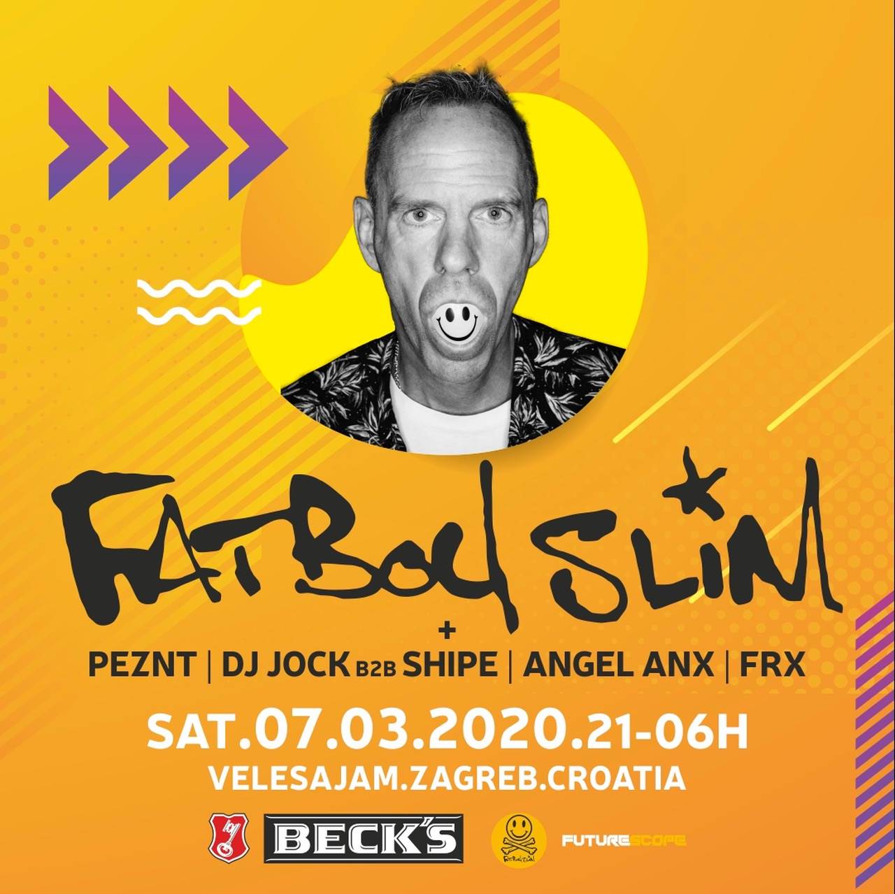 „Right Here, Right Now“, „Praise You“, „Weapon Of Choice“, „Rockafeller Skank“ i mnogi drugi mega hitovi svirat će se u subotu u Paviljonu 10A, na Zagrebačkom velesajmu. Organizatori su se pobrinuli za odličan line up koji će održavati vatrenu atmosferu na cjelonoćnom partyju - uz Fatboya, nastupit će Peznt, DJ Jock b2b SHIPE, Angel Anx i DJ FRX.