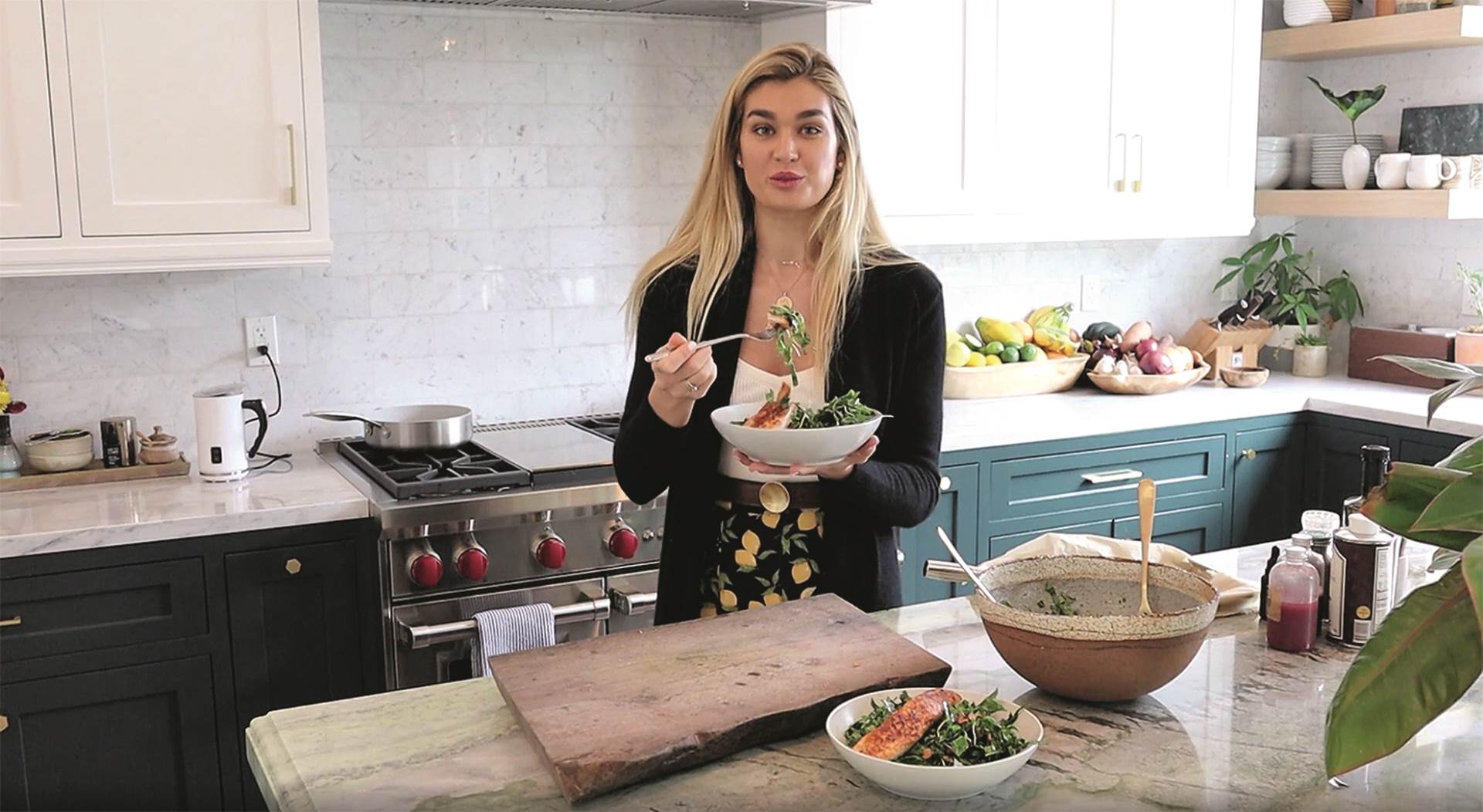 Salate su vam dosadne? Uz malo mašte možete ih podignuti na višu, ukusniju razinu, a prava je stručnjakinja za to model, chef i blogerica Shayna Taylor, djevojka američkog TV voditelja i poduzetnika Ryana Seacresta. Zgodna plavuša za svoga dragog s ljubavlju priprema ukusna i zdrava jela, a losos na tamnozelenoj salati jedno mu je od omiljenih. U jednoj epizodi videoserijala ‘What I Really Cook For Dinner’ dala je nekoliko savjeta za savršenu salatu - lišće kelja i raštike svakako ugrijte na tavici jer je lakše probavljivo, koristite svježe začinsko bilje, a sastojci u salati neka budu veličine zalogaja.