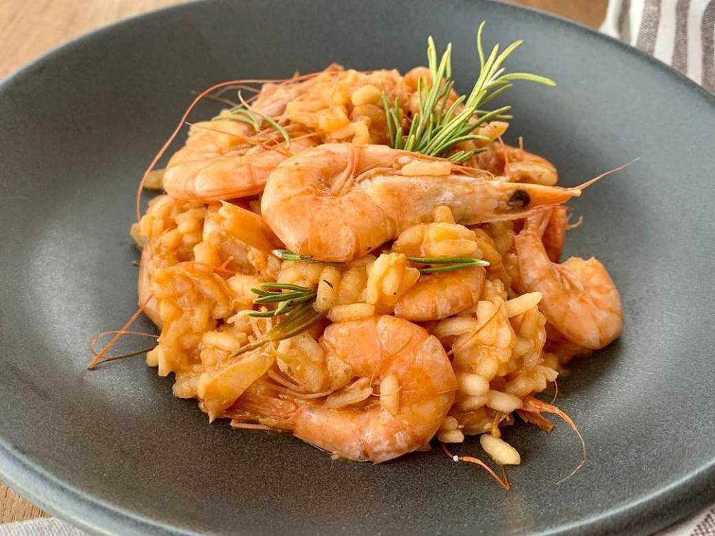 Za početak, napravite i zagrijte jušni temeljac. Na maslinovom ulju prodinstajte nasjeckani luk, dodajte češnjak, te zatim repove kozica, kratko promiješajte (20-30 sekundi) pa ih stavite uz rub, na jedan dio tave koji malo odmaknite od vatre.