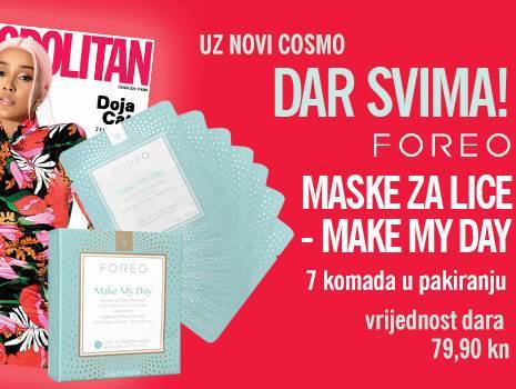 Toliko maski za lice FOREO Make My Day poklanjamo uz novi broj Cosmopolitana koji vas danas čeka na kioscima. Napucana hijaluronskom kiselinom i crvenim algama koji dubinski hidratiziraju kožu i štite je od nečistoća za kožu koja blista kao nikad do sad, Make My Day masku možete—ali i ne morate—koristiti sa UFO uređajem. Osmišljena je s ciljem da koža blista od jutra do mraka. Vrijednost paketa FOREO Make My Day maski je 79,90 kn, što znači—you do the math:)