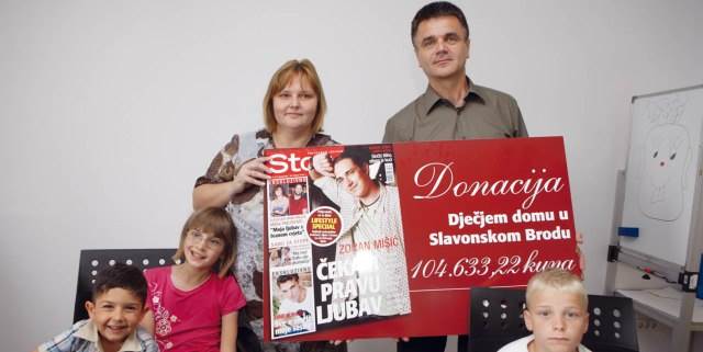 Glavna urednica Storyja Tonkica Kalauz i publisher Storyja Marijan Topolovec okrunili su veliku Storyjevu humanitarnu akciju uručenjem čeka u iznosu od 104.633,22 kuna ravnateljici Doma za nezbrinutu djecu Slavonski Brod Renati Puljko. Nakon što su predali ček, toplo ugostili dječicu koja su došla u posjet redakciji. Kulminacija dobrotvorne akcije bio je Storyjev rođendanski broj u svibnju po cijeni od 8 kuna, kad je svaki čitatelj kupnjom tog broja izdvojio jednu kunu za plemeniti cilj. Uz vjerne čitatelje, koji su potpomogli preređenje Doma, celebrityjima je također pružena prilika da sudjeluju u akciji tako što im je uručena uplatnica na koju su individualno donirali novac za humani cilj. Da je odaziv celebrityja i čitatelja bio velik, pokazuje hvalevrijedna suma od 104.633,22 kune kojom će djelatnici Doma obnoviti prizemlje zgrade, a sljedećom Storyjevom akcijom najavljuju obnovu podruma i vanjske fasade. Cijela priča s plemenitim ciljem počela je za Božić, kad se glumac Goran Višnjić za svečani Storyjev broj fotografirao sa sinčićem Tinom i suprugom Ivanom. Oduševljeni činjenicom da nekome mogu pomoći fotografijama i novčanim iznosom, supružnici su sa Storyjem započeli humanu priču, odnosno proces ponovnog preuređenja zgrade Doma, sagrađene davne 1960. Zajedničkom akcijom Storyja i obitelji Višnjić prvo su obnovljeni hodnik, vrata i zidna obloga muške odgojne grupe. Potom su se vrijedni zaposlenici Doma upustili u preuređenje stubišta, od prizemlja do drugog kata, koje je zapuštenom inerijeru dalo vedriju i zdraviju atmosferu. Budući da je potreba za obnovom zgrade, u kojoj do svoje 18. godine žive napuštena i nezbrinuta djeca, puno veća od novca kojim se raspolaže, svaka je donacija i pomoć dobrodošla. Ravnateljica Renata Puljko nada se i očekuje da će se ubrzo urediti kompjutorska učionica, prostor za likovne aktivnosti i teretana. U postupku je izmjena vanjske stolarije, koja će se također obaviti uz pomoć donacija. Dom za nezbrinutu djecu Slavonski Brod egzistira od 1952., a zgrada je sagrađena prije 49 godina i prilično je nastradala u Domovinskom ratu. Generacijama mladih ljudi ta je kuća bila jedini dom koji danas treba obnovu i ulaganje. Unatoč svim teškoćama, od neimaštine do nedostatka samopuozdanja malih štićenika, vrijedni im zaposlenici nastoje nadomjestiti ljubav i dom. Svake se godine, pa tako i ove, ide deset dana na more, na otok Brač u Vinkovačko odmaralište, koje im je ustupilo smještaj. Nadareni štićenici odlaze na dramske, sportske i regionalne susrete, sva se djeca dosta druže, što je iznimno važno za samopouzdanje jer svi oni zaslužuju nadu za bolju budućnost.