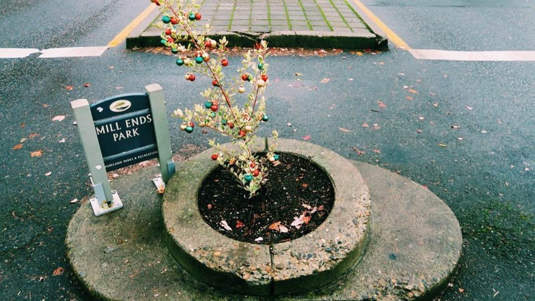 Nalazi se u srednjoj prometnoj traci na cesti Naito Parkway i ima samo jedno drvo koje je okruženo betonom. Zapravo su 1948. godine na tom mjestu trebali postaviti rasvjetni stup, no kako to nije učinjeno, počeo je rasti korov pa je kolumnist dnevnih novina Oregon Journal, Dick Fagan posadio cvijeće.