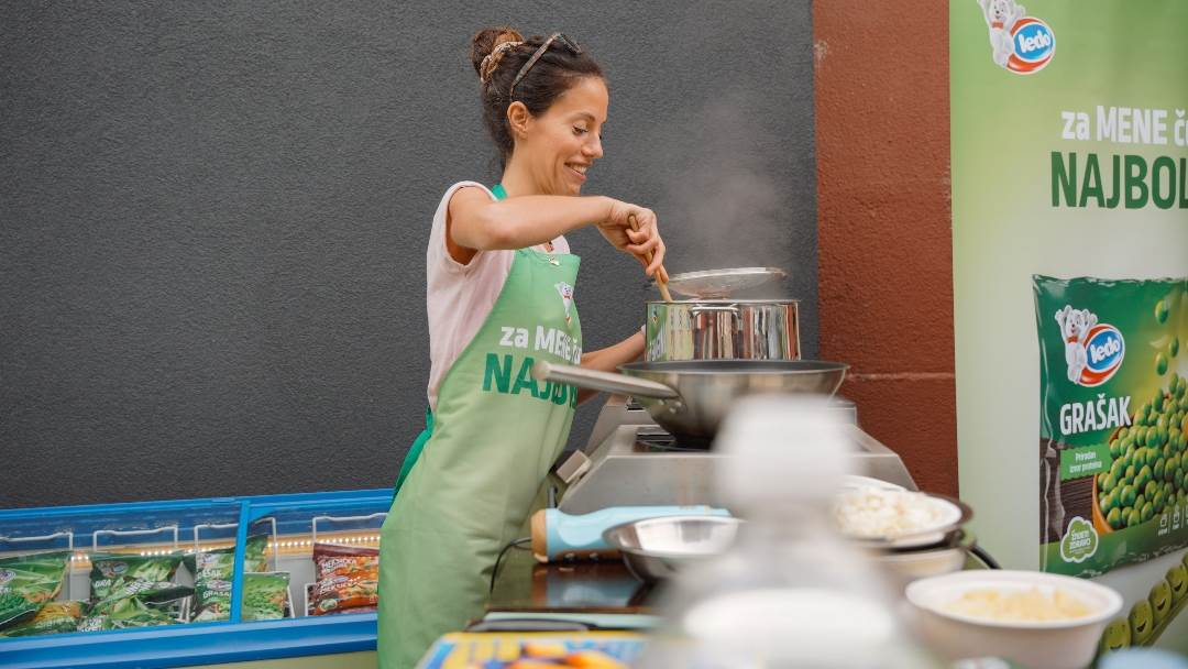 'Više volim jesti nego kuhati, pa ako ne moram, nije mi problem izbjeći tu obvezu', kaže u šali voditeljica i spisateljica Emina Pršić Prasnikar, koja je na Ledo radionicu došla s kćeri Leilani. Unatoč tome što se, kako je sama rekla, ne žuri preuzeti kuhaču, na radionici je s kćeri marljivo sjeckala luk, mijesila griz i ulje te na kraju i zapjevala. Otkrila nam je također da svi u obitelji jako vole grašak i to pripremljen po receptu kojeg je preuzela od mame – 'na crveno'.