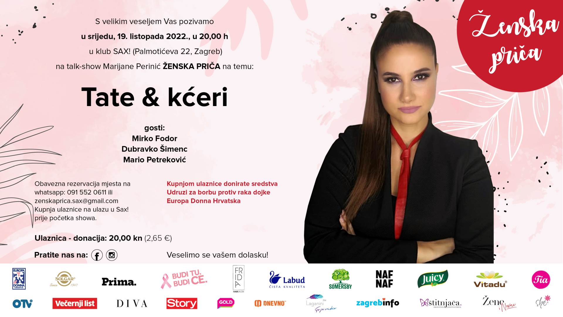 Novo izdanje Ženske priče održat će se u klubu hrvatskih glazbenika SAX! (Palmotićeva 22, Zagreb), u srijedu 19.listopada 2022 u 20 sati, a sav prihod od ulaznica donirat će se udruzi u borbi protiv raka dojke Europa Donna Hrvatska. Obavezna je rezervacija mjesta za posjetitelje na WhatsApp 091 552 06 11 ili na zenskaprica.sax@gmail.com