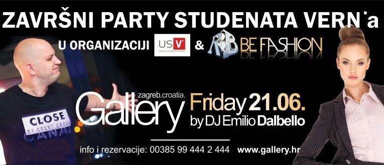 Nakon niza studenskih obaveza vrijeme je za odmor i zabavu! Stoga su ovaj petak mladi studenti VERN-a odlučili zajedno provesti večer u Gallery klubu, na partyju u organizaciji Be Fashion. Tamo će ih DJ Emilio Dalbello uz R'n'B zvukove odvesti na zasluženi godišnji odmor, i to na nedavno otvorenoj terasi Gallerya. Na završni party studenata VERN-a, pozvani su i svi ostali željni zabave i odličnog provoda.