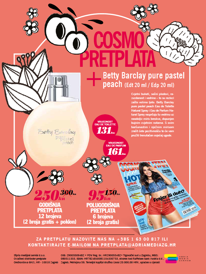 Za sve čitatelje koji se do 31. kolovoza pretplate na Cosmopolitan pripremili smo iznenađenje! Kupite godišnju pretplatu i odaberite svog mirisnog favorita - Betty Barclay pure pastel peach Eau de Toilette Natural Spray (20 ml) ili Betty Barclay pure pastel peach Eau de Parfum Natural Spray (20 ml). Godišnja pretplata obuhvaća 12 izdanja magazina Cosmopolitan i dar – miris Betty Barclay pure pastel peach, te iznosi 250 kuna.