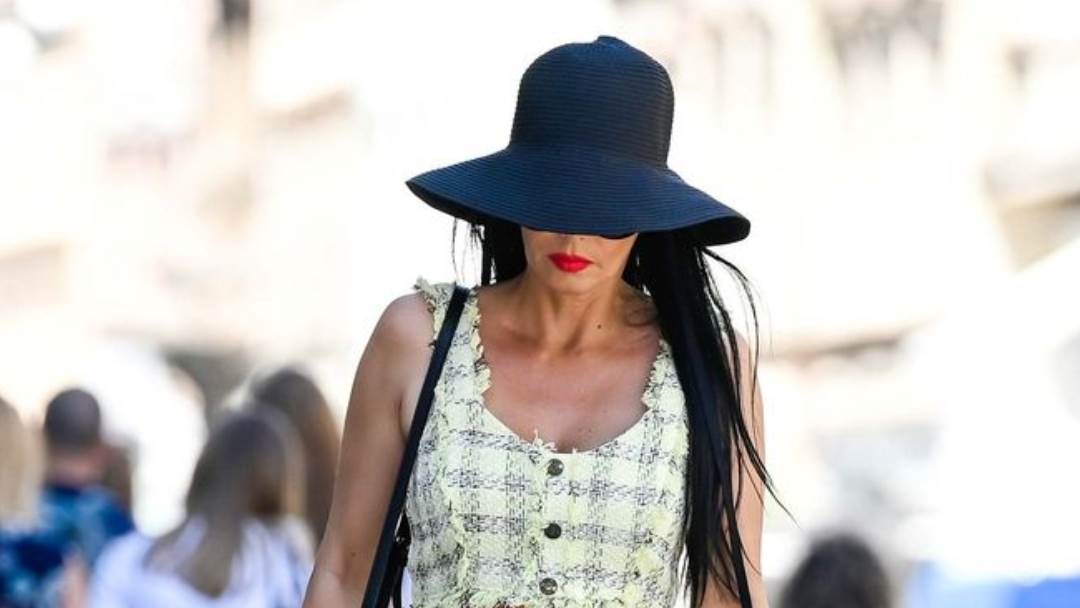 Ovaj stajling upotpunila je elegantnim crnim šeširom, špagericama, sunčanim naočalama i crnom torbicom. Crveni ruž i lak za nokte dodatno je istaknuo njezin preplanuli ten.