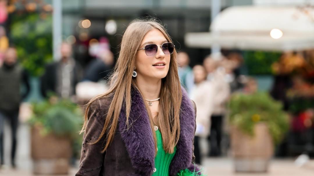 Uz to je iskombinirala ljubičastu jaknu od brušene kože s krznenim obrubima, ogrlicu s biserima i naušnice s ametistom, ljubičastim dragim kamenom.