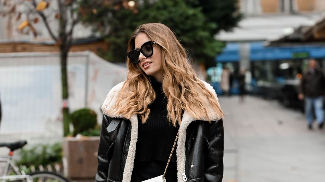 Prekrasna mlada dama kožnu pilotsku jaknu s podstavom od umjetnog krzna iskombinirala je uz kratku, crnu vesticu te midi suknju s visokim prorezom.