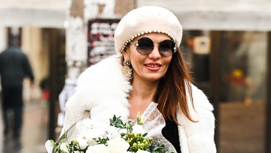 Ivančica je odjenula sive traperice, crni top na vezanje i čarapa-čizme. Tamne komade 'razbila' je bijelim kaputom s krznenim detaljima. Outfit je upotpunila beretkom s perlama koju je uskladila sa sunčanim naočalama, također s detaljima perla.
