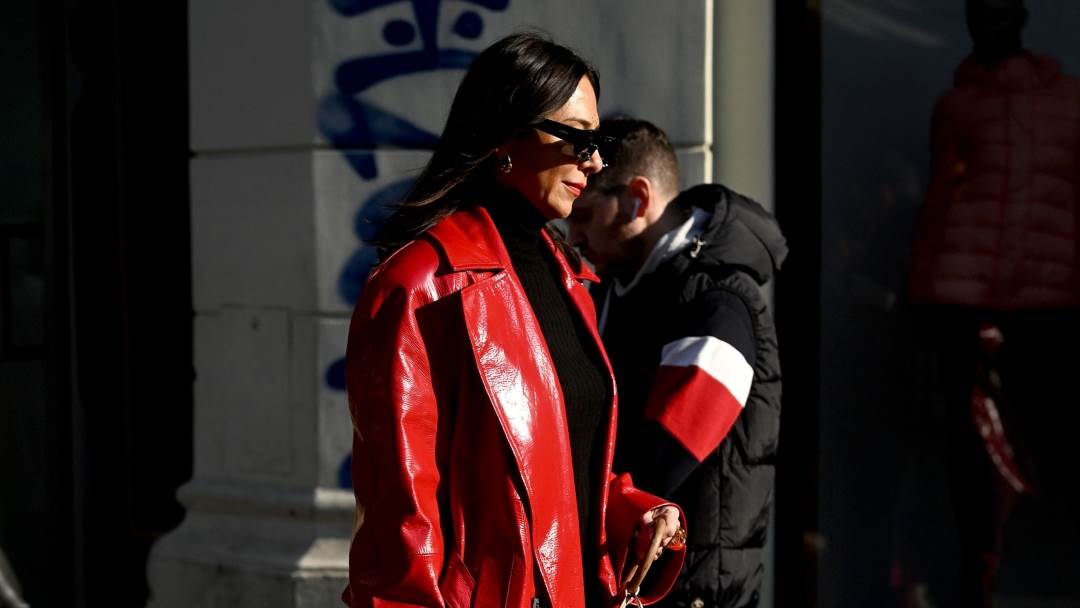 Crveni lakirani kaput uskladila je s avangardnim čizmama s visokom platformom i block petom. Crvene komade naglasila je crnim hlačama i dolčevitom.