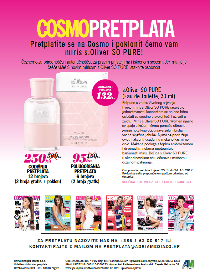 Ova ponuda pretplate traje od 25.09. do 24.10.2017. Godišnja pretplata (12 brojeva) iznosi 250 kuna, a uključuje dar i dva broja Cosmopolitana gratis. Vrijednost dara iznosi 132,00 kune. Potražite listopadsko izdanje Cosmopolitana na svim kioscima!