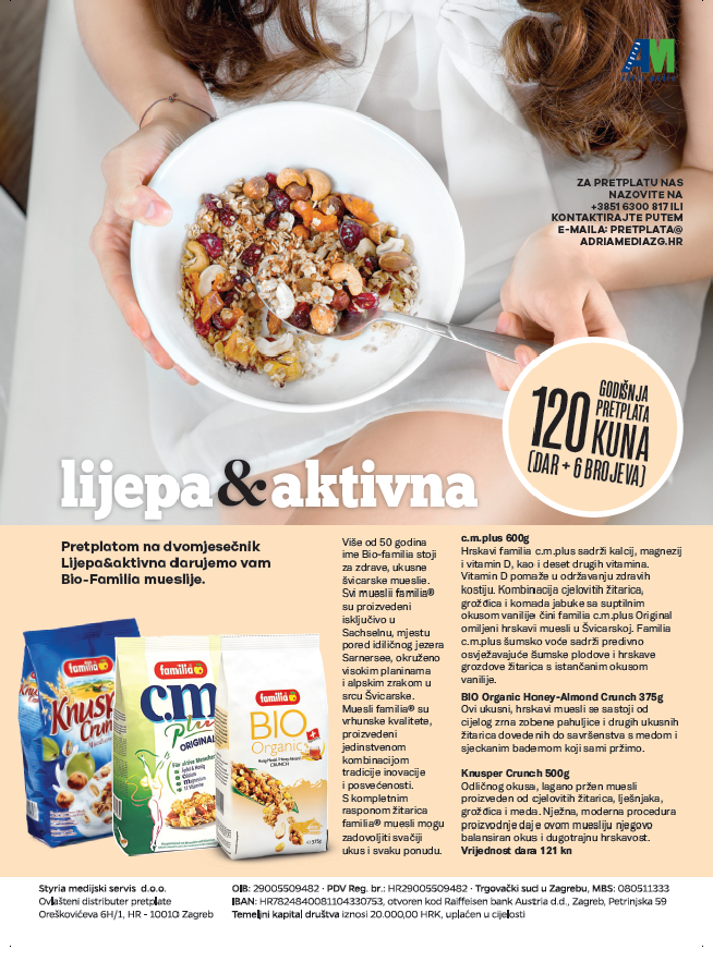 Pretplatom na dvomjesečnik Lijepa&aktivna darujemo vam Bio-Familia mueslije. Ponuda vrijedi do 27. veljače 2018. godine.